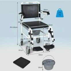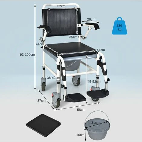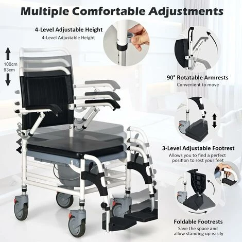 Our commode wheelchair can be used as a safe & comfortable shower chair, private commode chair, portable normal chair and convenient wheelchair, satisfying your different needs. Thanks to the commode bucket with a lid and a carrying handle, the chair can be used anywhere as a standalone commode, and you can also detach the bucket using it directly over a toilet. Made of durable PVC material and anti-rust aluminum, the chair is waterproof and anti-skid, so you can sit on it to enjoy your bath without worrying about slipping. More than that, the 4-level adjustable height and 3-level adjustable footrest would meet people of different heights to get optimal comfort.