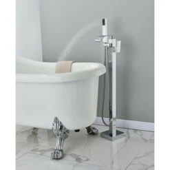 4.【Conception au sol】 – Robinet de bain autoportant, châssis de grand diamètre, sol plus stable, durabilité améliorée, match parfait avec la baignoire, profitez de l’heure du bain.La douche à main est un design moderne et élégant. Il est parfaitement intégré au robinet de baignoire principal.