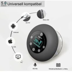 The new bathroom suction cup waterproof Bluetooth speaker features a built-in microphone for hands-free calling, a display of display, an electronic clock, Bluetooth playback, radio and other functions, and can display the radio frequency. High-definition sound quality, built-in 1000mA polymer lithium battery, up to 12 hours playtime, IPX4 waterproof system. Enjoy life the way you want. Powerful Suction Cup│IPX4 Waterproof | Portable design.