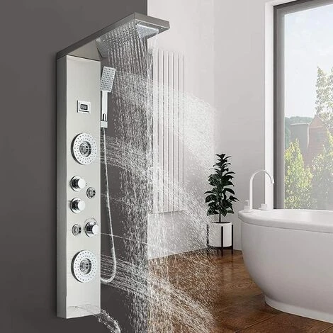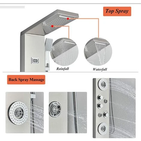 ❤6 Functions: rainfall shower head and waterfall shower head, handheld shower, body massage jets and bathtub spout and temperature display.