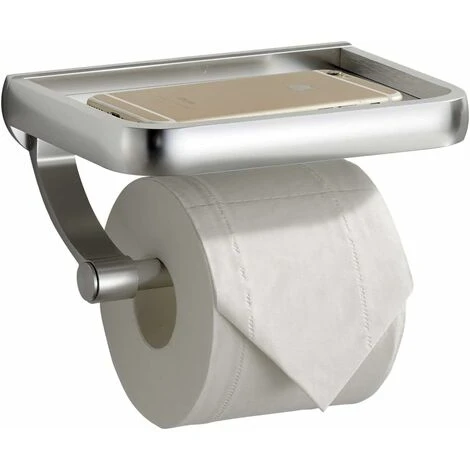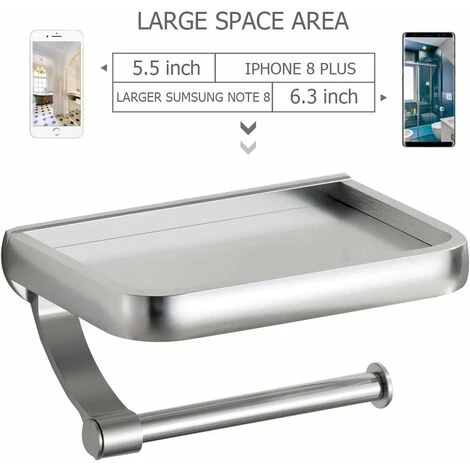 [Heavy-Duty Aluminum] – toilet paper holder is made of the premium aluminum craftsmanship is rust and corrosion resistant for long-lasting durability even in the hottest shower room. The smooth, elegant design the matte finish fits perfectly with any style of bathroom decor or personal color choices or layouts.^[Easy Installation& Stable]: Our toilet paper holder comes with all the hardware plus a spare of each part. With two screw holes so it can be mounted on your wall solidly and easily. After a couple of month using, you will see our item will still stay on your wall firmly while the 3M adhesive paper holder fall off from the wall.^[Large Storage Shelf] : 6.7” long and 4.9” wide, this rimmed platform easily holds an iPhone X, Samsung Note 8, and all of large size smart phoe so it doesn’t fall out of your pocket. with the round roll hanger, it can also protects paper rolls from falling out.^[Versatile Convenience] :The large, wide design not only holds your cellphone, it can be used as a rest for baby diapers, girls used pad, key, lighter, watches, glasses, or other accessories. bathroom paper holder will bring great benefits to you, women, children, and old people.^