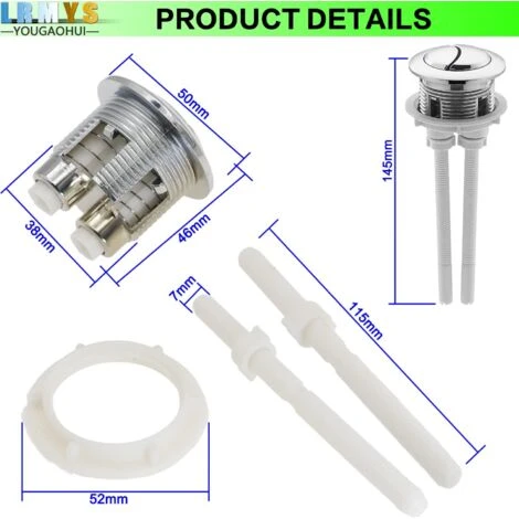 PRODUCT DETAILS – Material: Plastic; Silver color ; Finished: mirror-surface treatment; Round shape ; Type: Double push button; Lid diameter: 50mm; Cover screw diameter: 38mm; Bolt Shank Diameter: 7mm; Bolt Shank Length: 115mm; Fixing Nut Diameter: 52mm; Overall height: 145mm (bolt shank can be cut); Total weight: about 35g.
